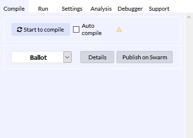 - the Compile tab: used for compiling a smart contract and publishing on Swarm