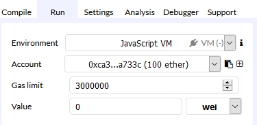 Next, let’s deploy the contract with our JavaScript VM. Switch to the Run tab, and select JavaScript VM from the dropdown menu.