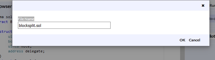 A new dialog will pop up Enter a name for your file (blocksplit.sol), then press OK: