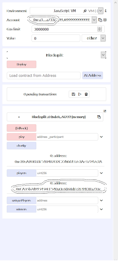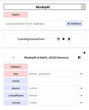 Under the name and address of the deployed contract, we have some buttons with red and blue colors. Red buttons refer to actions that cause a write to the blockchain (in our case the fallback and play functions) and need a transaction, where blue buttons refer to reading from blockchain (charity, players, uniquePlayers and winners public variables we defined in the contract’s code).