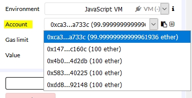 The JavaScript VM provides five fake accounts with 100 ether each, which we can use to test the contract. You can select a current account from the dropdown menu with the name Account below the Environment dropdown.