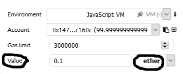 Now, to send money to the contract, we first set the Value variable (between 0.001 and 0.1) and the unit (ether) from the dropdown menu. Then we call the fallback function by simply clicking on its corresponding red button.