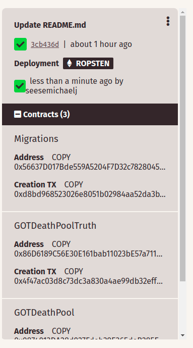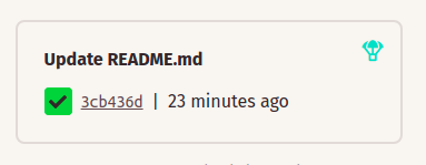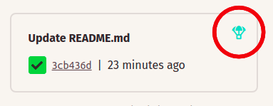 Commits is a list of all the commits that Truffle Teams is processing, or has processed, as a build. Each will have a status icon to show if the build is in progress, failed, or successful. Commits with a successful icon (a green box with a checkmark, as pictured) will be able to be deployed; the parachute icon in the top right of the commit indicates this.