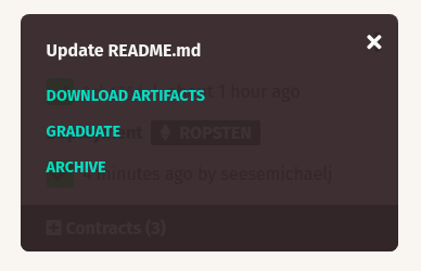 You can also click the vertical 3 dots in the top right of the card to find a menu. In this menu, you can download a .zip file of the Truffle .json artifacts used in your frontend webapp, graduate a deployment to production, or archive the deployment. Note: Be careful when using the archive feature; we haven't implemented a way to unarchive deployments yet.