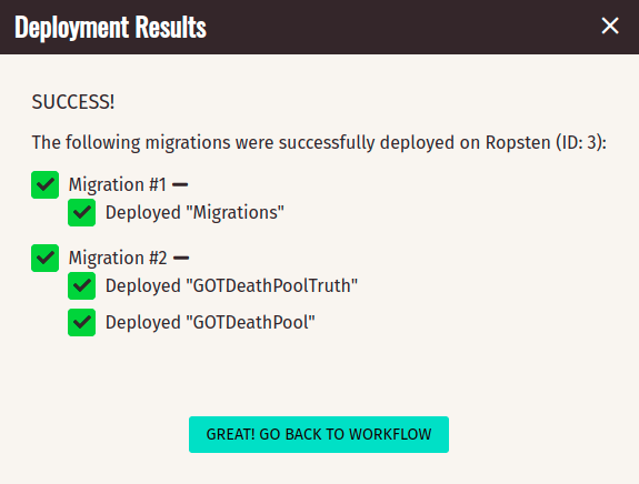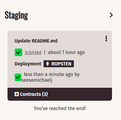 Your contracts are deployed! That was easy. Go ahead and push the Great! Go Back to Workflow button or the X in the wizard. You'll now see a new card in the Staging column with the results of your deployment: