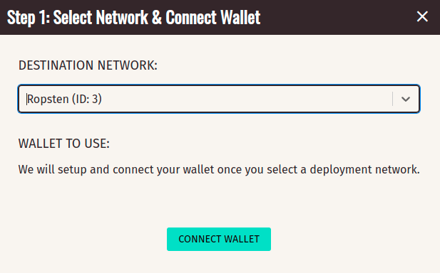 A wizard will pop up; under Destination Network, select Ropsten, and then press Connect Wallet.
