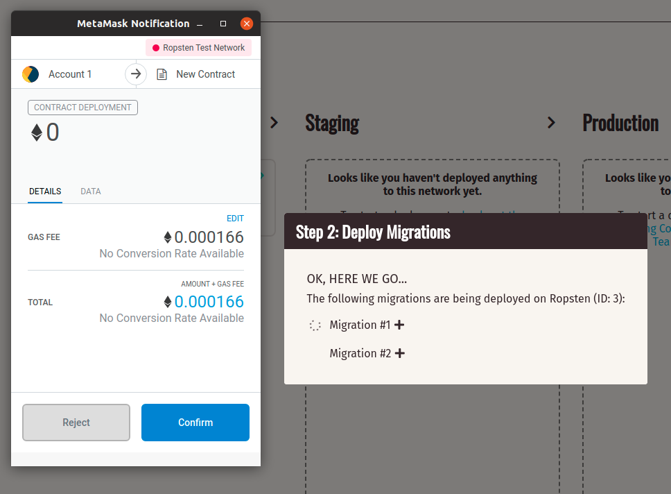 Once you're happy with the transaction gas fee, press the Confirm button to send your transaction. Once the transaction is confirmed (the timing of confirmations from MetaMask and Truffle Teams may be slightly offset), you'll receive the next transaction. Repeat this process until you see a message that your deployment is being finalized.