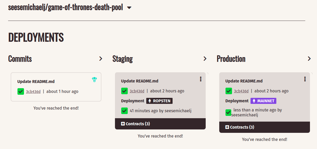 Happy with a particular deployment in Staging? You can select the Graduate option from the menu to use the same build as the basis of your deployment into Mainnet. Other than selecting a different network in MetaMask, the steps are the same! After you're done, you'll see a new deployment in the production section.