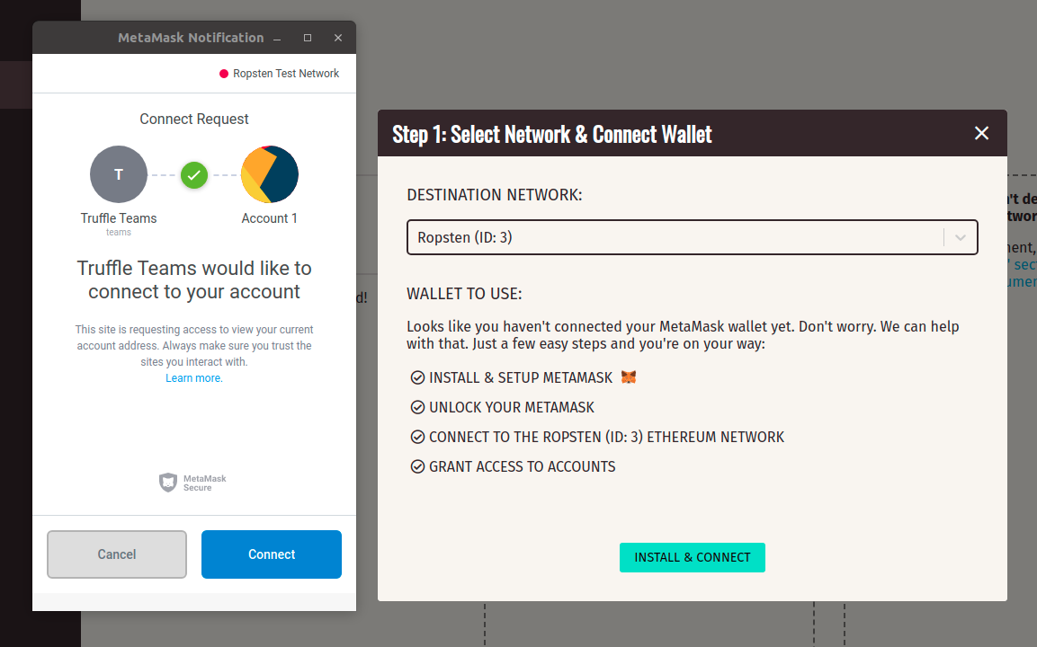 MetaMask will pop up asking you to login (if you haven't already). Then you will need to press Connect to confirm the connection with Truffle Teams.